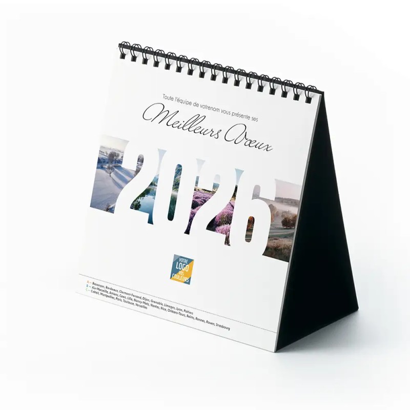 Dans notre atelier des Hauts-de-France, nous concevons, imprimons et fabriquons des calendriers personnalisés qui allient savoir-faire local et excellence d’impression. Découvrez notre sélection 2026 : chevalets de bureau, calendriers bancaires, modèles muraux ou versions exclusives avec chocolats. Chaque création reflète l’identité de votre entreprise grâce à une personnalisation complète : logo, photos, formats. Un support publicitaire élégant et distinctif, pensé pour valoriser vos clients comme vos équipes.