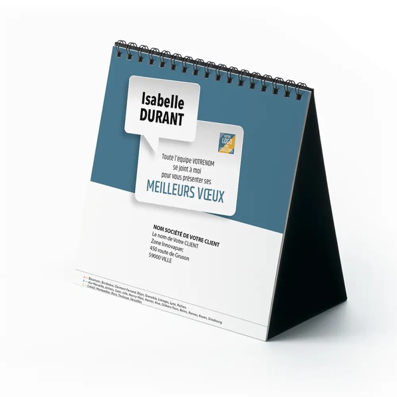 Le calendrier chevalet personnalisé est un objet publicitaire élégant et pratique. Grâce à ses feuillets reliés par une spirale, il tient parfaitement sur un bureau ou un comptoir. Il propose une lecture mois par mois, idéale pour suivre son planning au quotidien. Plus visuel et attrayant, il permet de mettre en valeur davantage d’images tout en affichant votre logo et vos coordonnées. Présent sur le bureau de vos clients, il devient un outil de communication puissant et utile toute l’année. Il est complémentaire du calendrier bancaire qui permet d’avoir une vision globale de l’année.