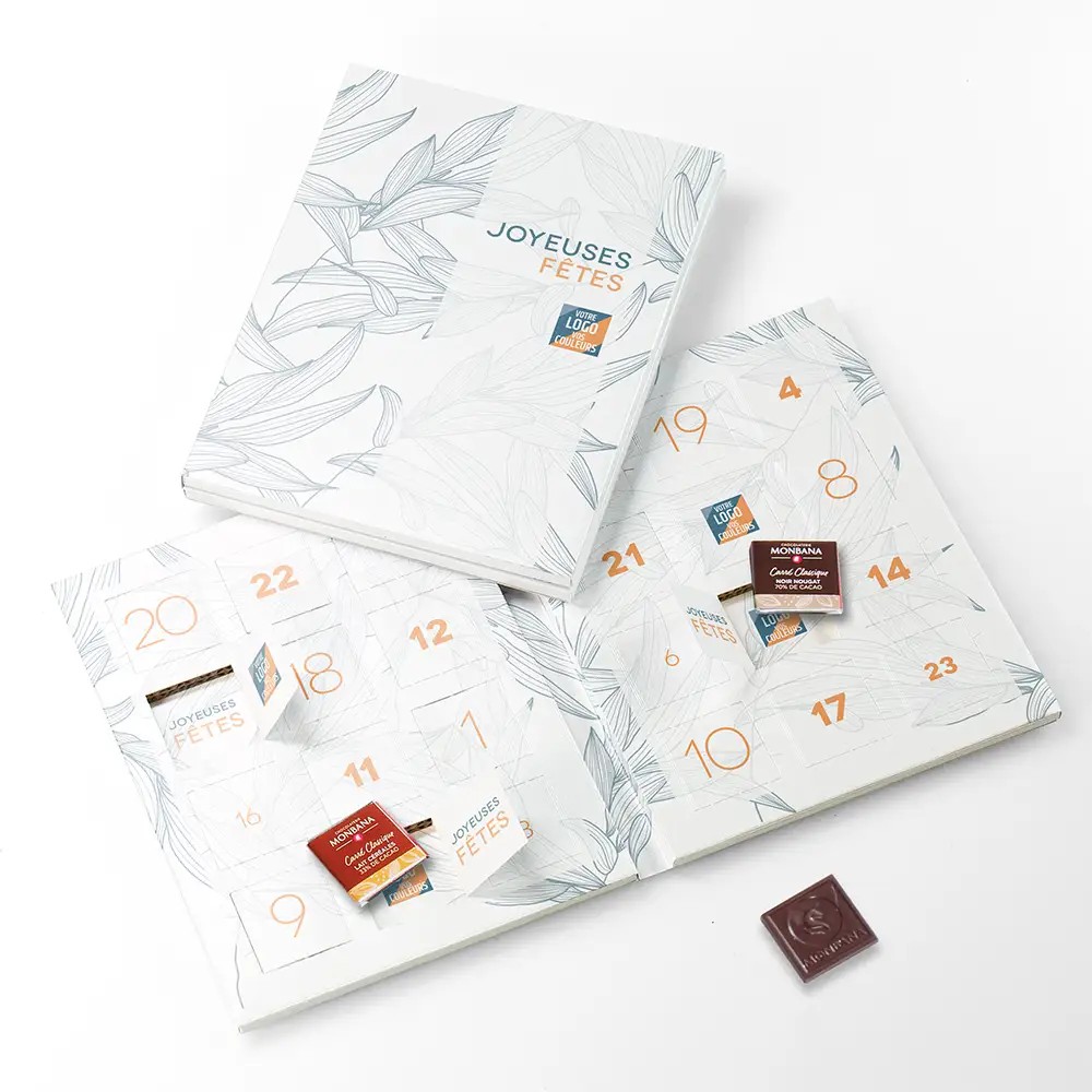 Découvrez notre calendrier de l'Avent personnalisé Book et ses 24 chocolats Monbana. Ils se déclinent en 6 saveurs délicieuses, pour plaire au plus grand nombre. Personnalisez votre calendrier de l'Avent aux couleurs de votre marque. En savoir plus