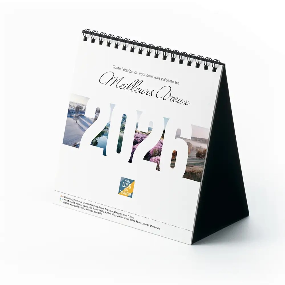 Pour personnaliser vos calendriers chevalets, choisissez parmi nos thèmes de photos : Nature, Urbain, Sportif, Culture, Entreprise... En choisissant un thème graphique, vous renforcez votre identité de marque. De plus, vous offrez un calendrier de bureau magnifiquement illustré.