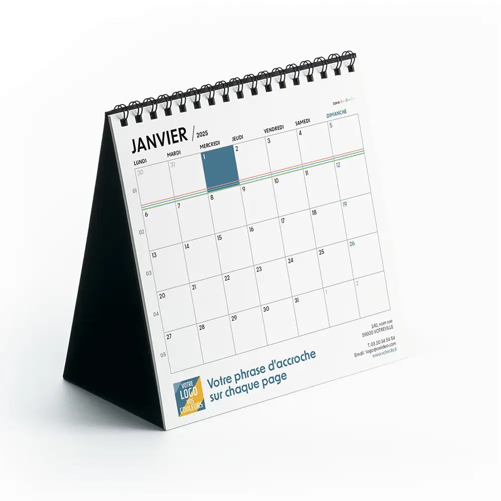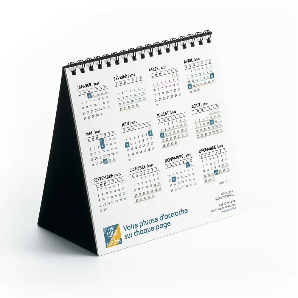 Le calendrier chevalet format intégral 15x17,5 cm offre un espace généreux pour votre création personnalisée. Très pratique, il permet de visionner 3 mois par page. Ce calendrier de bureau est parfait car il n’occupe pas beaucoup de place sur l'espace de travail. Le support du calendrier est personnalisé avec le logo de votre entreprise, votre phrase d’accroche et vos coordonnées. Un beau calendrier personnalisé à offrir à vos clients ou à votre équipe ! Les feuilles sont en papier 200 g et le support chevalet en carton 380 g.