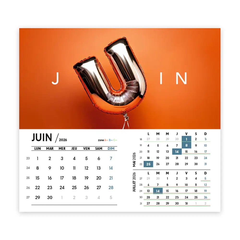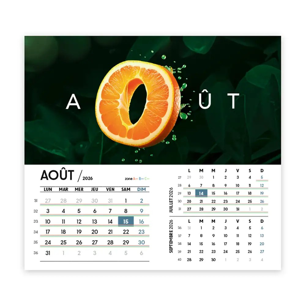 Le calendrier chevalet format intégral 15x17,5 cm offre un espace généreux pour votre création personnalisée. Très pratique, il permet de visionner 3 mois par page. Ce calendrier de bureau est parfait car il n’occupe pas beaucoup de place sur l'espace de travail. Le support du calendrier est personnalisé avec le logo de votre entreprise, votre phrase d’accroche et vos coordonnées. Un beau calendrier personnalisé à offrir à vos clients ou à votre équipe ! Les feuilles sont en papier 200 g et le support chevalet en carton 380 g.