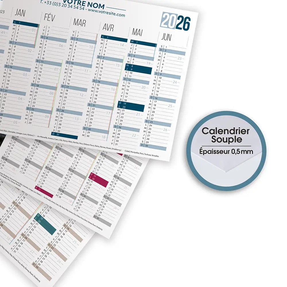 Nos calendriers bancaires en carton souple de 0,5 mm offrent une prise en main facile et une durabilité suffisante pour une utilisation tout au long de l'année. Ce type de carton est parfait pour ceux qui préfèrent un calendrier léger et facile à manipuler. Le calendrier conserve sa forme et son allure professionnelle même avec un usage fréquent.
