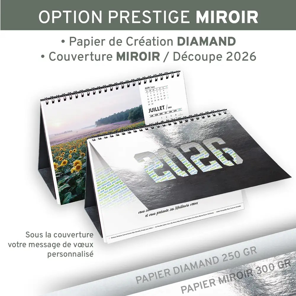 Choisissez le format prestige 21x15 cm pour un impact visuel maximum. Sa couverture avec découpe des chiffres de l’année assure un effet waouh ! Au recto, vous avez la photo de votre choix 3 mois visibles. Au verso, vous avez une large grille mensuelle. Les 2 faces sont personnalisables avec votre logo d’entreprise et vos coordonnées. Ce calendrier de bureau est le choix préféré des entreprises qui souhaitent offrir un cadeau de fin d'année de qualité à leurs clients ou à leur équipe. Les feuilles sont en papier diamant 250 g et le support chevalet en carton 400 g.