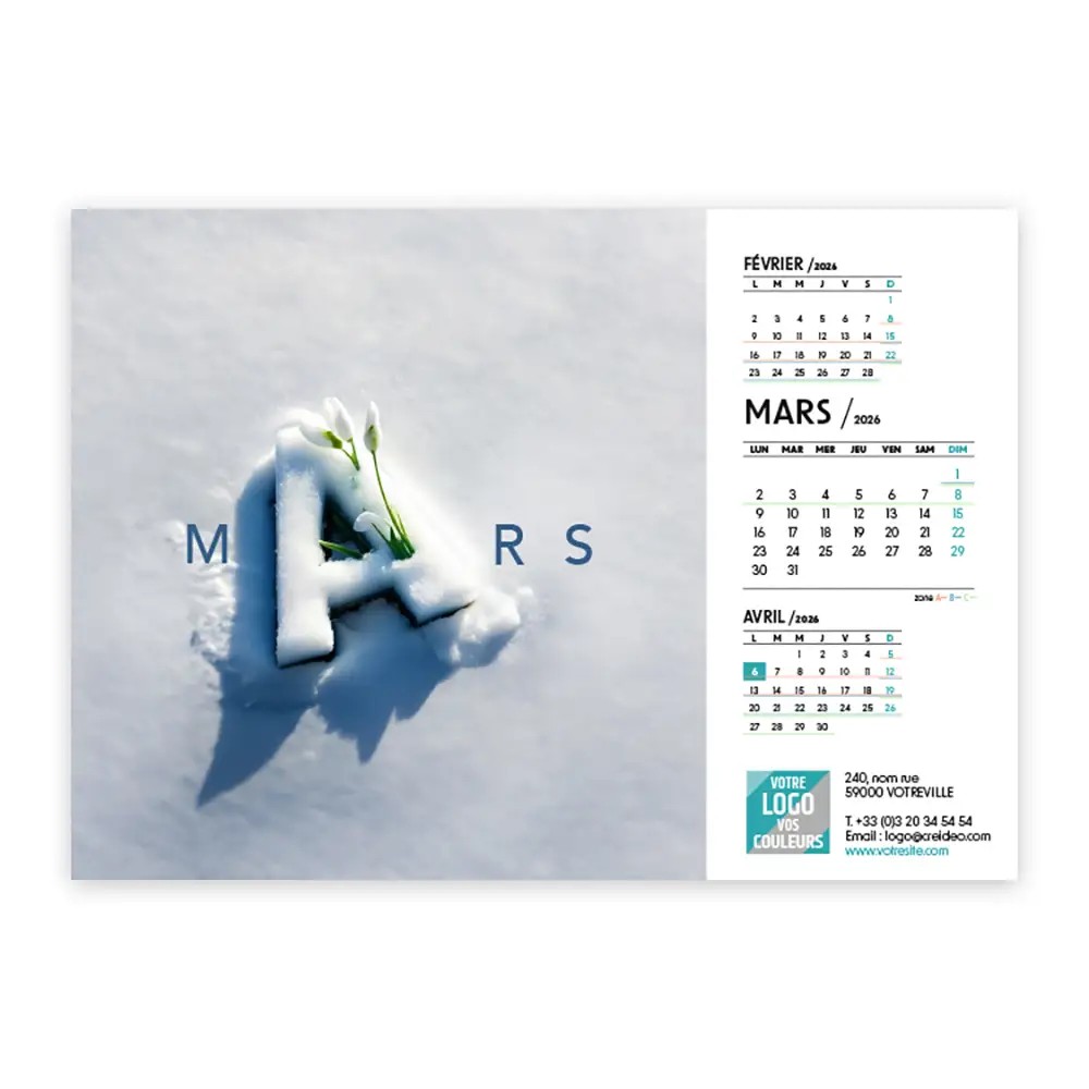 Choisissez le format prestige 21x15 cm pour un impact visuel maximum. Sa couverture avec découpe des chiffres de l’année assure un effet waouh ! Au recto, vous avez la photo de votre choix 3 mois visibles. Au verso, vous avez une large grille mensuelle. Les 2 faces sont personnalisables avec votre logo d’entreprise et vos coordonnées. Ce calendrier de bureau est le choix préféré des entreprises qui souhaitent offrir un cadeau de fin d'année de qualité à leurs clients ou à leur équipe. Les feuilles sont en papier diamant 250 g et le support chevalet en carton 400 g.