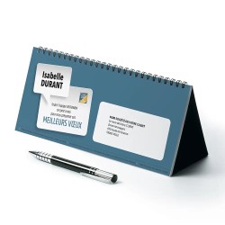 Notre calendrier chevalet format horizontal 23x10 cm personnalisable est conçu pour celles et ceux qui souhaitent allier élégance et fonctionnalité. Ce calendrier de bureau offre une belle surface pour les photos, votre logo et les coordonnées de votre entreprise. Vous pouvez choisir les vôtres ou parmi nos différents thèmes photos. La grille mensuelle est clairement lisible. Sa forme unique en fait un outil de communication publicitaire sur tout plan de travail. Les feuilles sont en papier 200 g et le support chevalet en carton 400 g noir ou blanc.