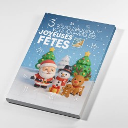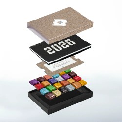 Notre carte de voeux personnalisée Calcao est une carte 3-en-1. À la fois carte de voeux, calendrier et boîte chocolats, qui dit mieux pour commencer l'année ! Découvrez un coffret chocolat astucieux qui devient un calendrier chevalet, le tout personnalisable aux couleurs de votre entreprise. Une carte de voeux que l'on garde sous les yeux toute l'année ! En savoir plus