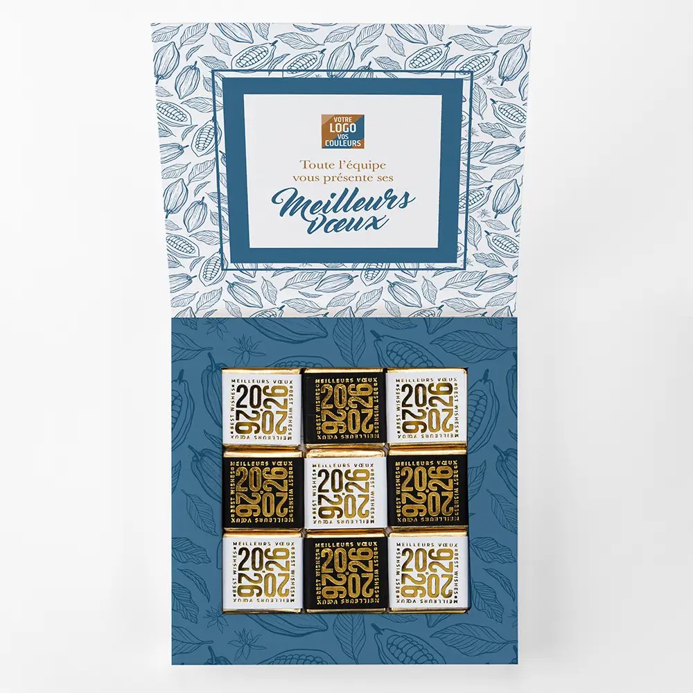Et si, en plus d'envoyez vos voeux, vous offriez des chocolats ? Avec nos cartes de voeux personnalisées et accompagnées de chocolats Monbana, vous pouvez le faire ! Nos cartes de voeux 2-en-1 en surprendront plus d'un de vos clients ou de vos collègues, tout en faisant plaisir aux gourmands. Chaque carte contient 9 carrés de chocolat, un assortiment de lait et de noir.